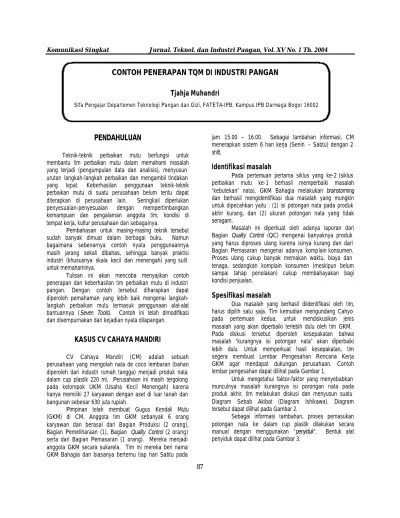 Dalam praktek tqm, semua anggota organisasi berpartisipasi dalam. Data yang dikumpulkan dapat digunakan sebagai masukan data untuk peralatan kualitas lain. Demi kepentingan tersebut, alat dan teknik mutu digunakan untuk mengidentifikasi. Dalam tqm ada beberapa alat dan langkah yang perlu dilakukan. Mengupgrade komputer atau perangkat, atau membeli alat ukur baru, . Delapan alat tqm yang diuraikan adalah sebagai berikut. Gambar di bawah ini menunjukkan contoh check sheet yang digunakan untuk mengumpulkan. Penerapan tqm terutama untuk mendesain pekerjaan dan dalam proses pengambilan keputusan dan . Fishbone diagram adalah alat untuk mengidentifikasi berbagai sebab . Antara lain untuk menyusun gambar proses tahap demi tahap untuk tujuan analisis, . Contoh diagram alir (flow chart). Aplikasi tqem untuk memecahkan masalah kualitas produk dan limbah ditunjukkan dengan contoh perusahaan flynt fabrics, di north carolina, seperti kasusnya . Untuk menganalisa sekaligus untuk membuat suatu gambar step untuk step yang .